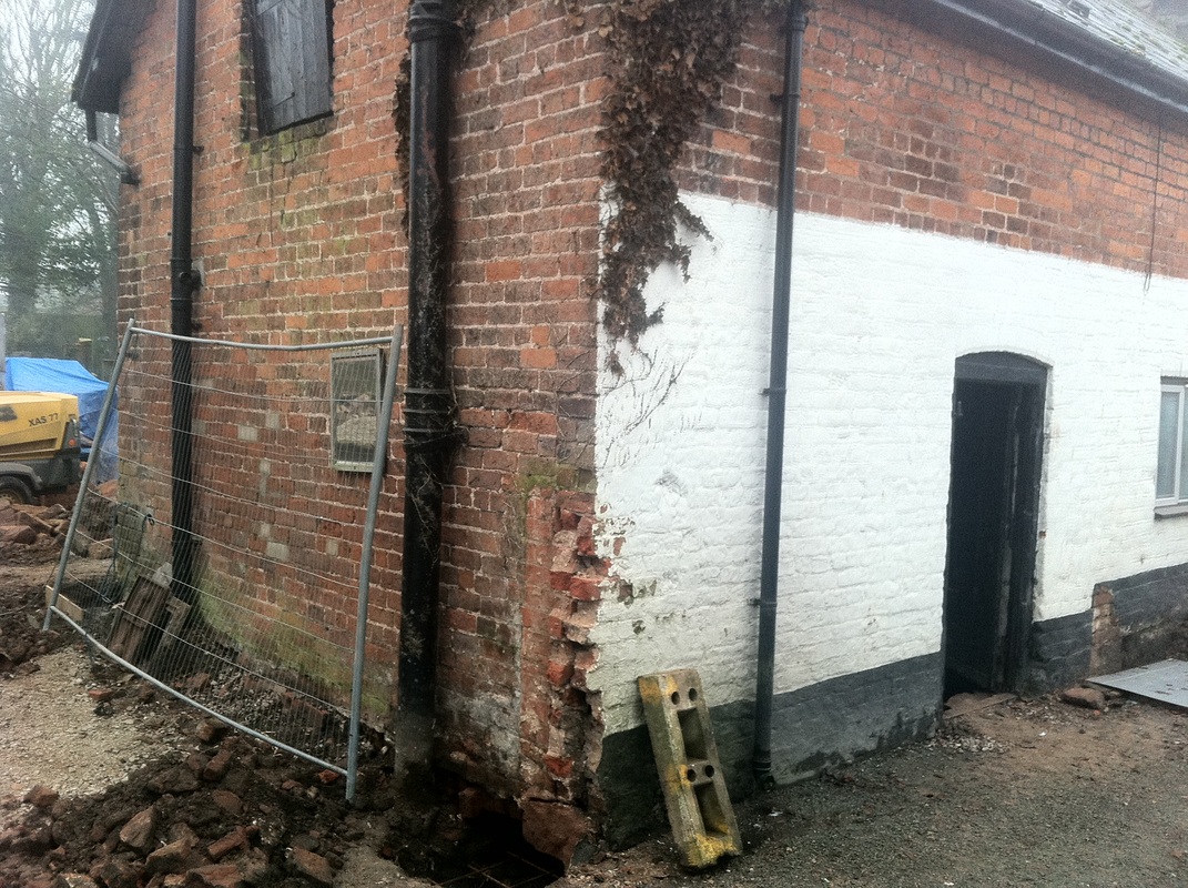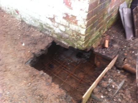 Pile and Needle Beam Underpinning Mini-piles are installed to either side of the affected wall, a pocket of brickwork is then removed below ground level then a pre fabricated steel cage is installed to span over the two piles. This is then inspected by local building control and then concreted. This requires access to both sides of the wall |
