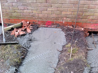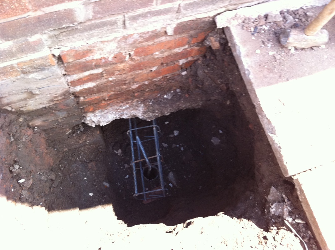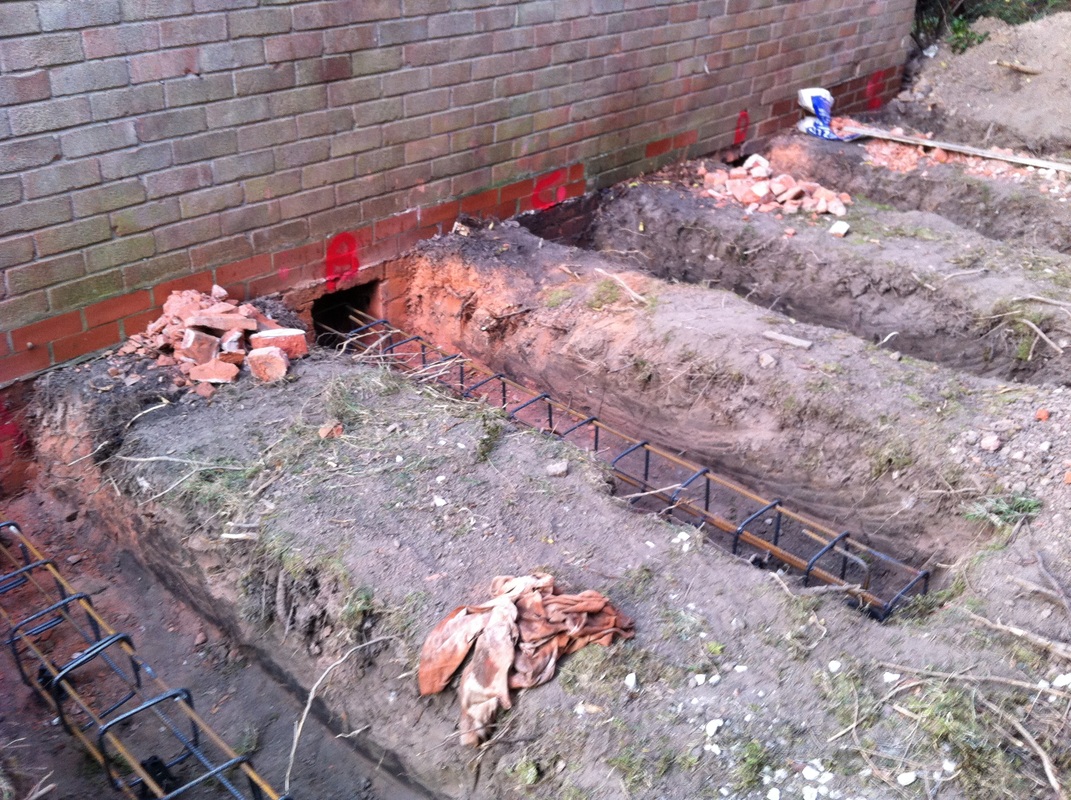 Piled Raft Underpinning This system of underpinning is used when it has been decided that the whole property has been affected. All existing floors are removed and mini piles installed. Pockets of brickwork are then removed and reinforcement placed as per the engineer’s specification. This is then inspected by the local building control and then concreted. |
